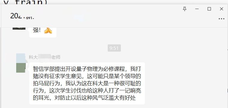 我相信类似的“烂课”、“水课”在科大不算少数,科大的本科教学质量也并没有做到和其课程的难度对等。念ppt,走马观花式的读稿,意识流一样的讲课,这些现象在你科屡见不鲜。坐牢一样的听课体验,痛苦的自学经历,我相信诸多你科学子都有所体会。这些摆在台面上的严重问题难道不是科大真正应该重视改进的地方吗?连自己专业本职的课程都教不好,怎么还有精力推出这样一门粗制滥造的量子物理课程挤兑同学们宝贵的时间呢?