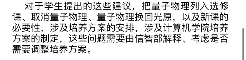 在同样的时间段,信智学部其他学院也在纷纷反映对量子物理的意见。令人失望的是,量子物理这门课并不是哪个学院说了算的,各学院纷纷表示,还需要进一步向信智学部反馈。