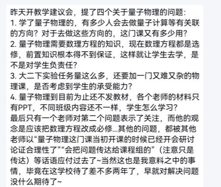 三月初期,我们班便已经接到jwc通知,要求收集对量子物理这门课的意见。我班义愤填膺的各位同学在班群中各抒己见,认真讨论了量子物理存在的问题与调整的方法,从中午一直讨论到晚上。最后整理出了上千字的意见和建议文档,当晚就提交给了jwc,然而至今也没有得到jwc的回复