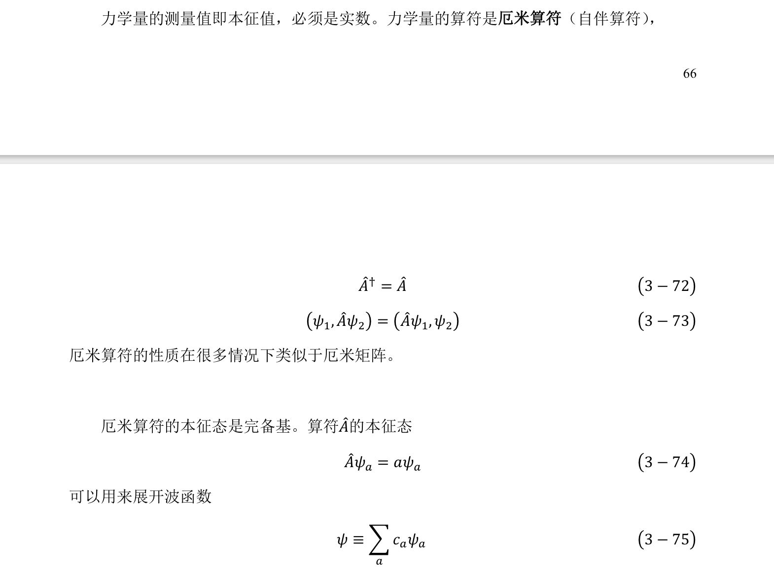 可惜当时没有人告诉我这个东西的定义其实是在四十页后的109页,我想破了头也没搞清楚所谓厄米算符到底是什么意思。