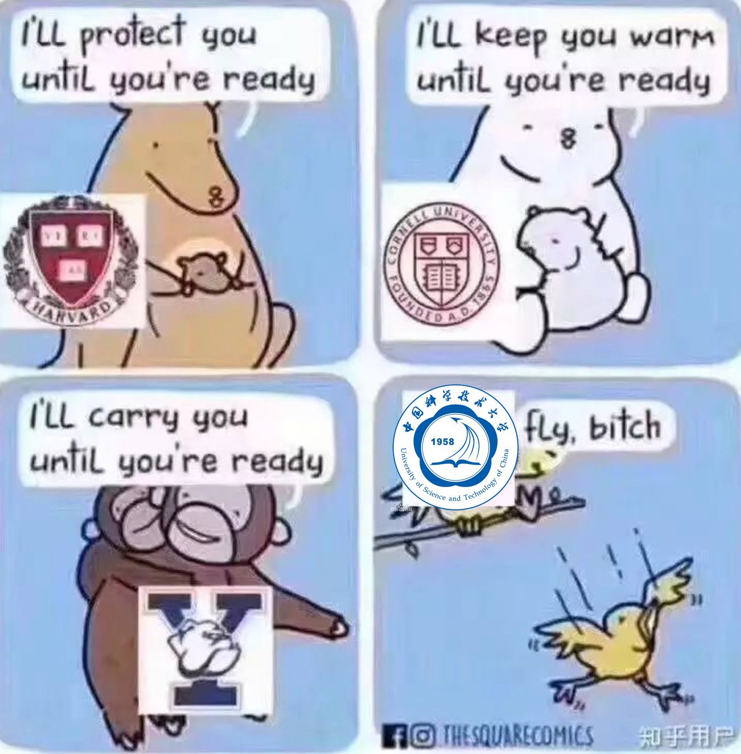 在这样养蛊式的教育环境下。你科只要把任务布置到满,课程难度调到最高,钢铁一般抗压的科大学生总能学会,毕竟内卷的压力摆在学生的面前,学不会就只有被淘汰。至于学生学起来轻不轻松,上课能不能听懂,这些仿佛都与学校关系不大,你科仿佛认为只需把学生送上内卷赛道的流水线,最终就能得到“红专并进,理实交融”的毕业生。可是千生一院士的背后是残酷的六人五毕业,看起来仿佛一片大好的考试成绩的背后是多少学生苦与泪的凝聚。我不懂科大在招生时是怎样标榜自己的教学质量的,但在我看来,你科的芸芸众生不是教出来的,是逼出来的。