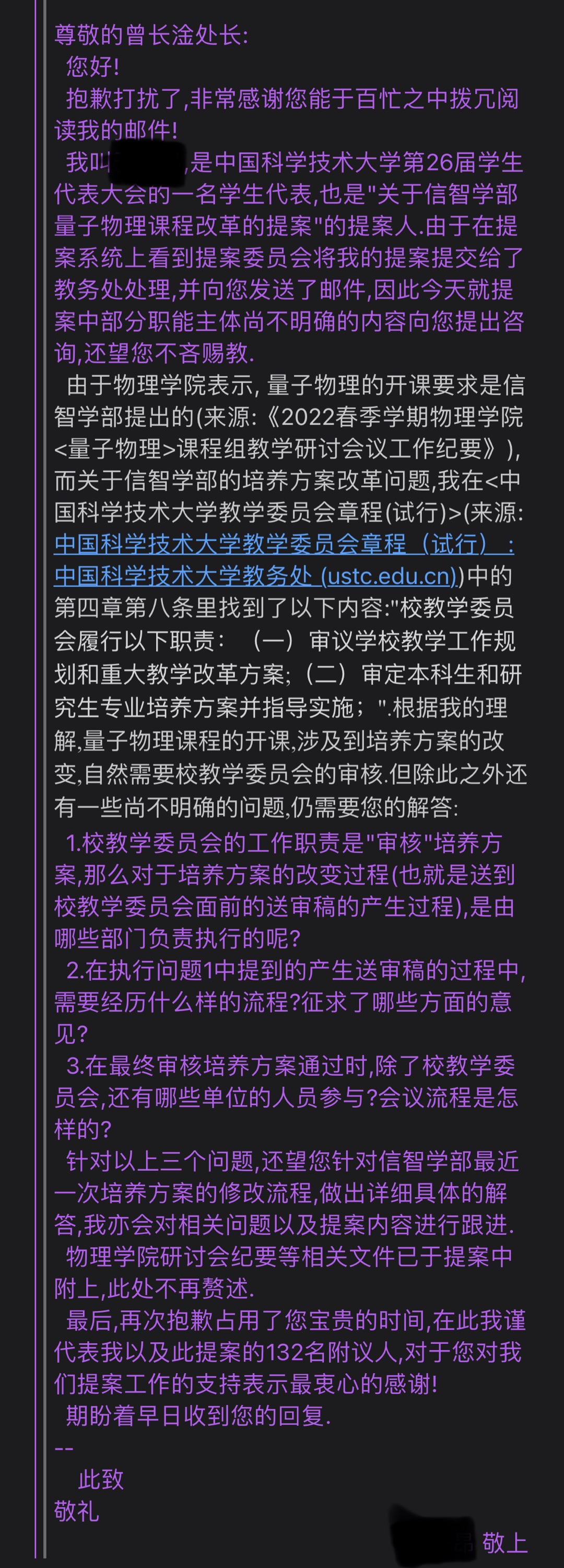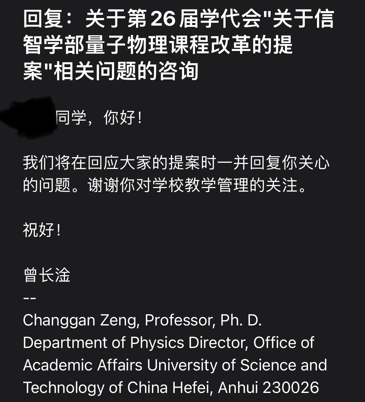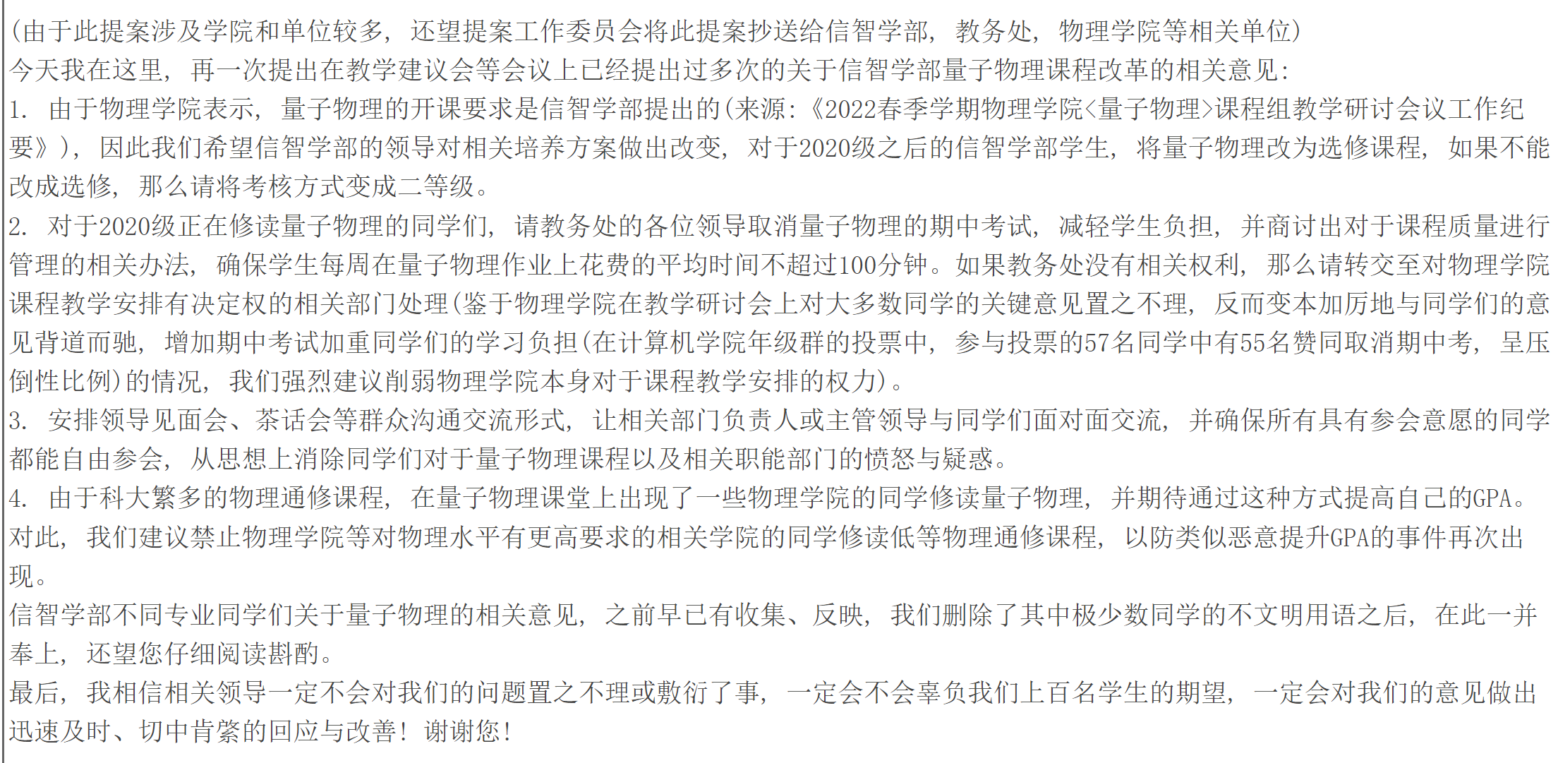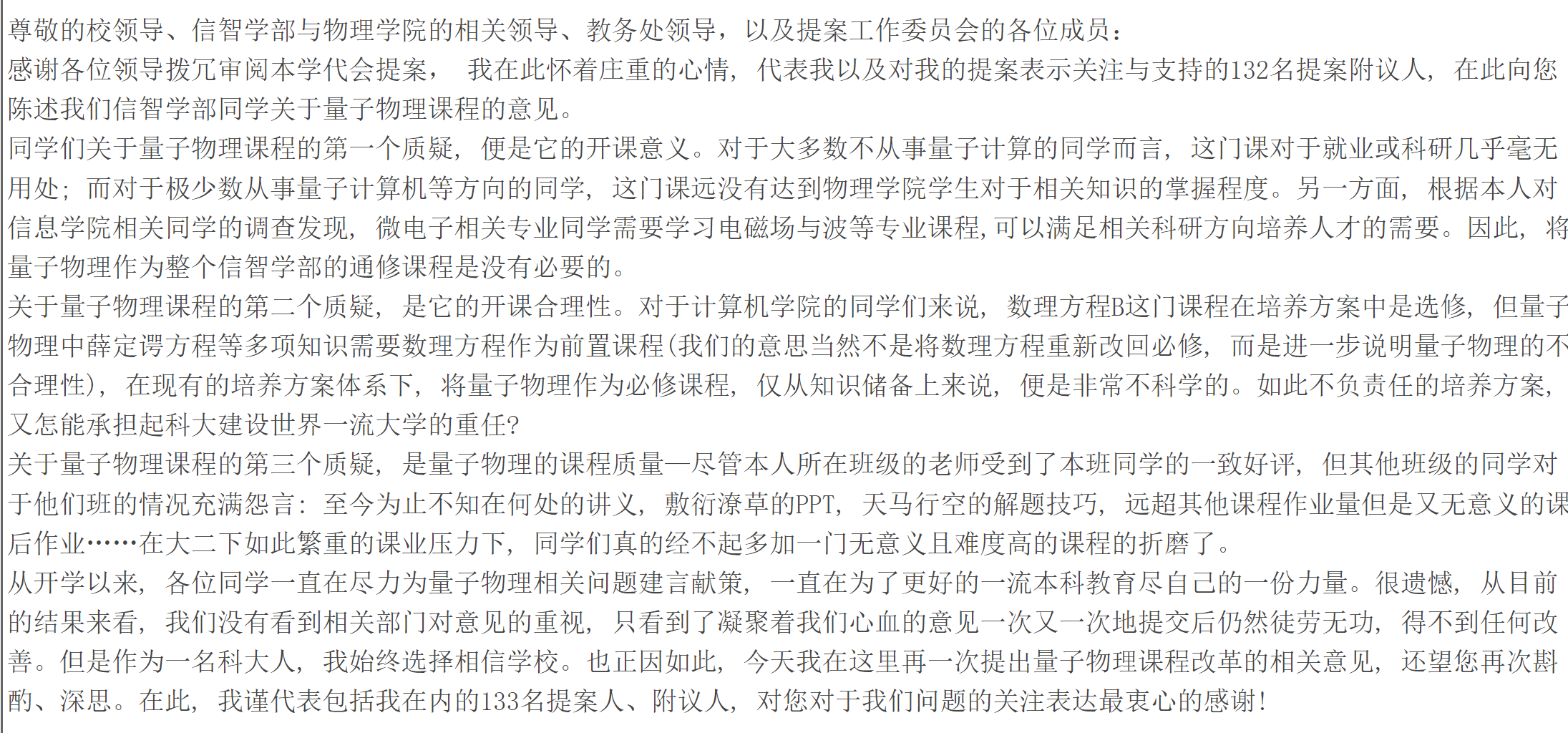 看到这次 132 位同学联名向学校反馈量子物理课程的事情,也是仅有的三个学代会优秀提案之一,甚感欣慰。希望这件事情不要沉寂下去,如果能成为推动信智学部培养计划改革的一个契机,将是功在当代,利在千秋的成就。