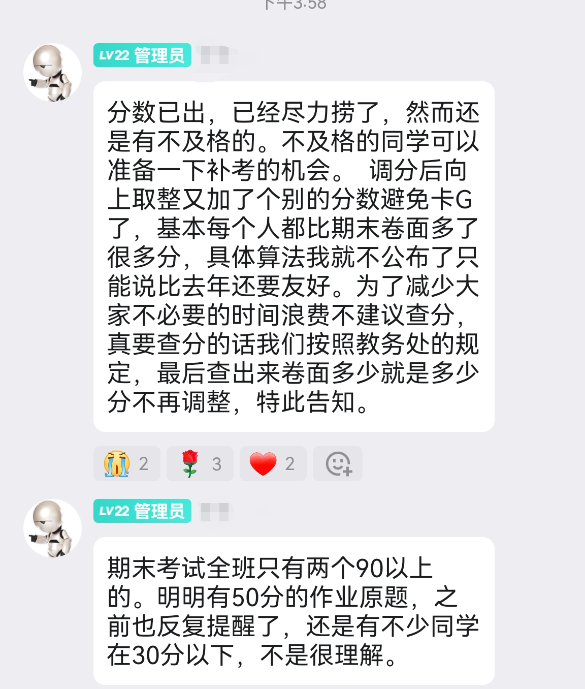 纯私货(可以略过):两次期中不幸赶上了两次发烧,一次高烧,一次低烧(今年流感真多),经常考前一天不睡觉的同学知道,这将会对低容错的24H突击式选手造成致命影响,悲惨的期中成绩让我准备好了拿3.0(乐观估计)—2.0(悲观估计)的成绩,但是最后总评确实超出了我的预料,在给我上过课的十几个老师里,杨老师不是讲课最好的一位,也不是优秀率最高的一位(大一有一些老师会给超出范围的优秀率,但是大二似乎并不常见),但是是最终给分和预期相差最大的一位(但这样的现象对于班里的其他同学来说可能大概并不普遍,所以该段评论有个人情感加持),功利且柯南的讲,本来不觉得老师是完美的,但是他给的实在是太多了😭。