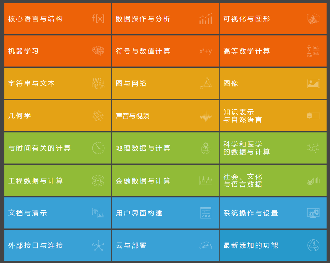 最后谈一下我对mma的一些个人看法。毫无疑问,mma在综合符号计算方面的能力应该是无出其右,无论是其遍布几乎常见所有科学领域的强大内置函数库(下图取自mma官方帮助文档的首页),