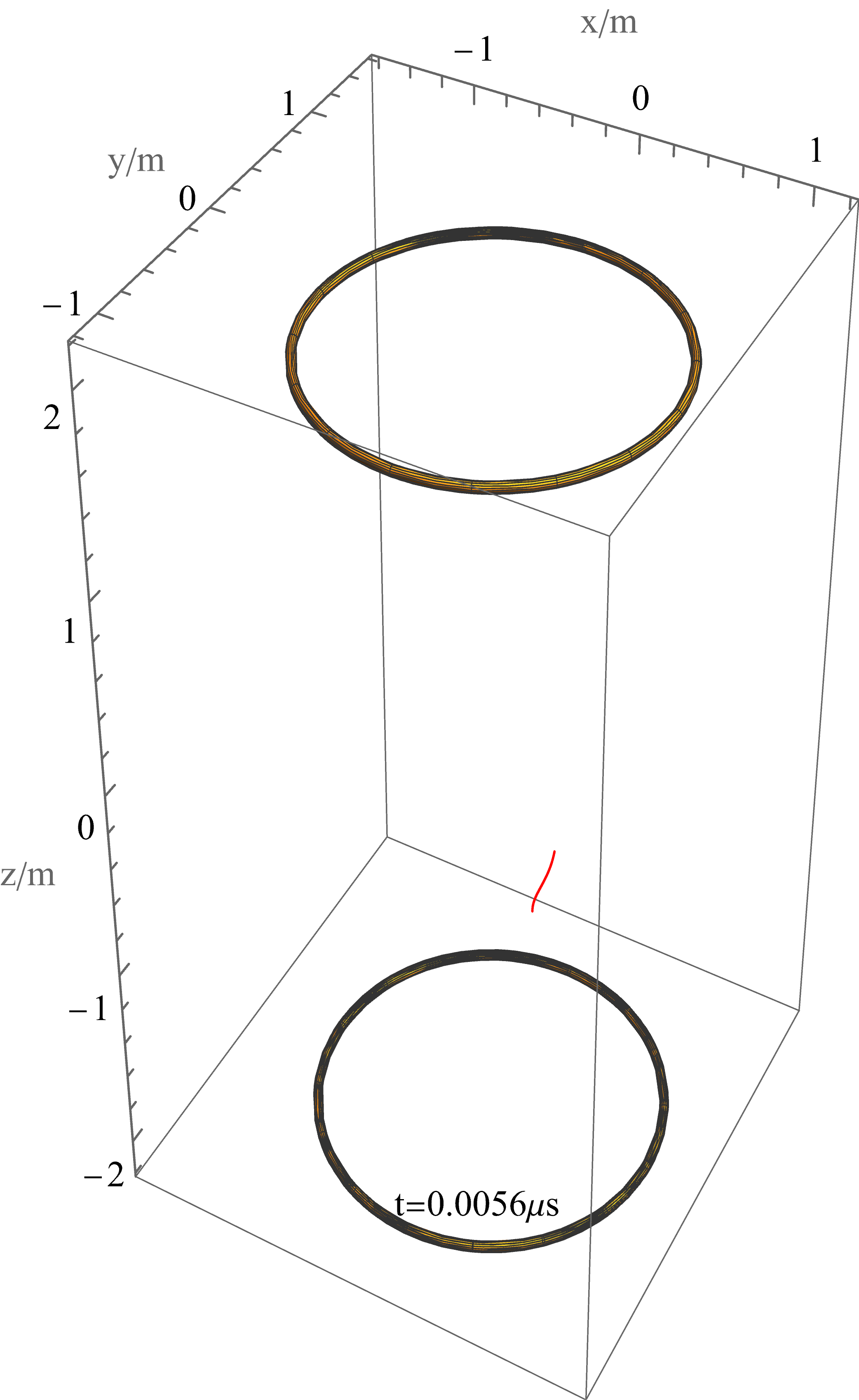总评构成是30%平时(作业+点名)+20%大作业+50%期末。大作业的话没有什么特别限制,想做什么都可以,然后有些同学就做了一些非常有意思的东西,例如抽卡器,还有画了个小黑子的(乐)。我自己的话是结合自己的专业相关知识做了一个磁镜加速的单粒子运动模拟,请看下面这个gif: