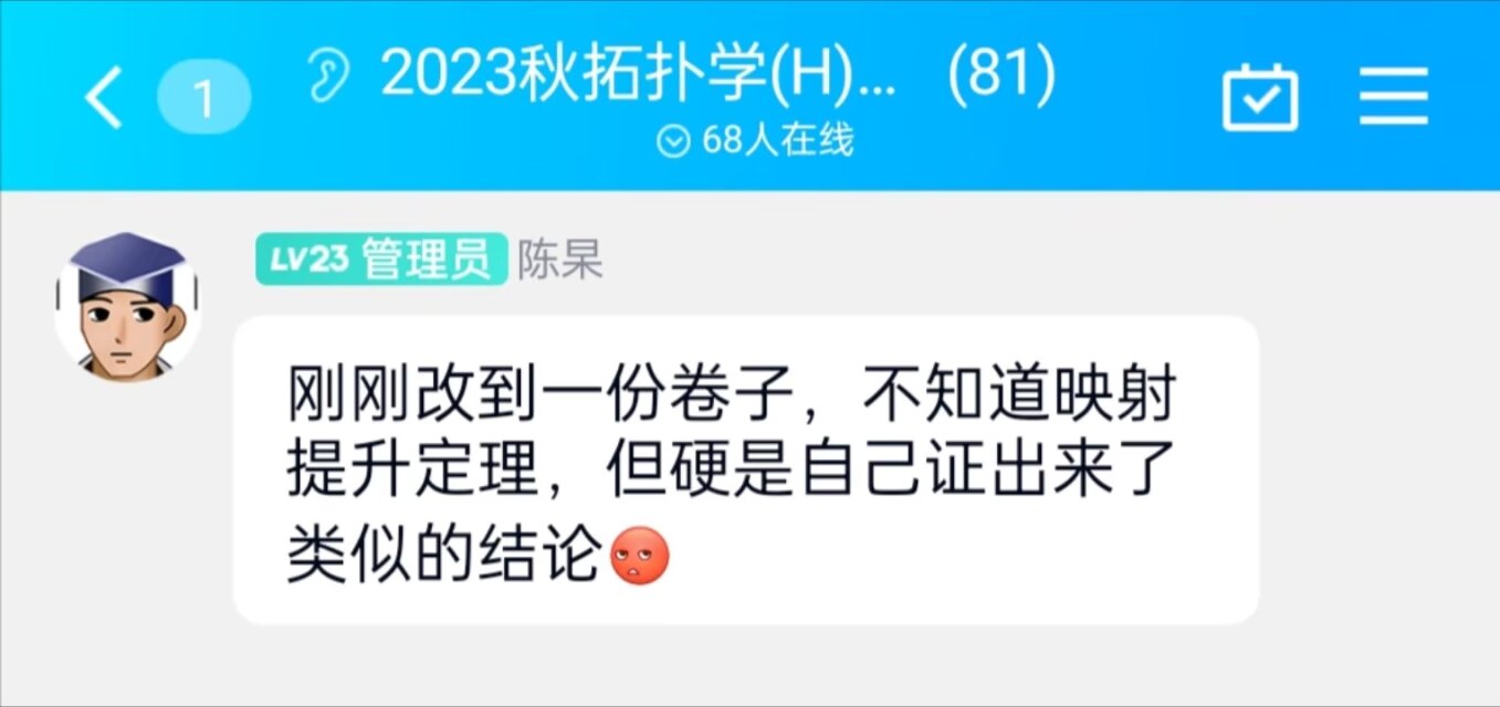 上到14周左右有点难绷,老师不备课(如果备过课还是这个样子,我也不知道是谁的问题了),板书细节混乱,有些大定理(如同伦提升引理、van-Kampen 定理)讲完估计只有cg自己能看懂(也有可能他也看不太懂)。上课有些人对照的是火箭讲义而非课本,很可能放弃了记笔记,乐。