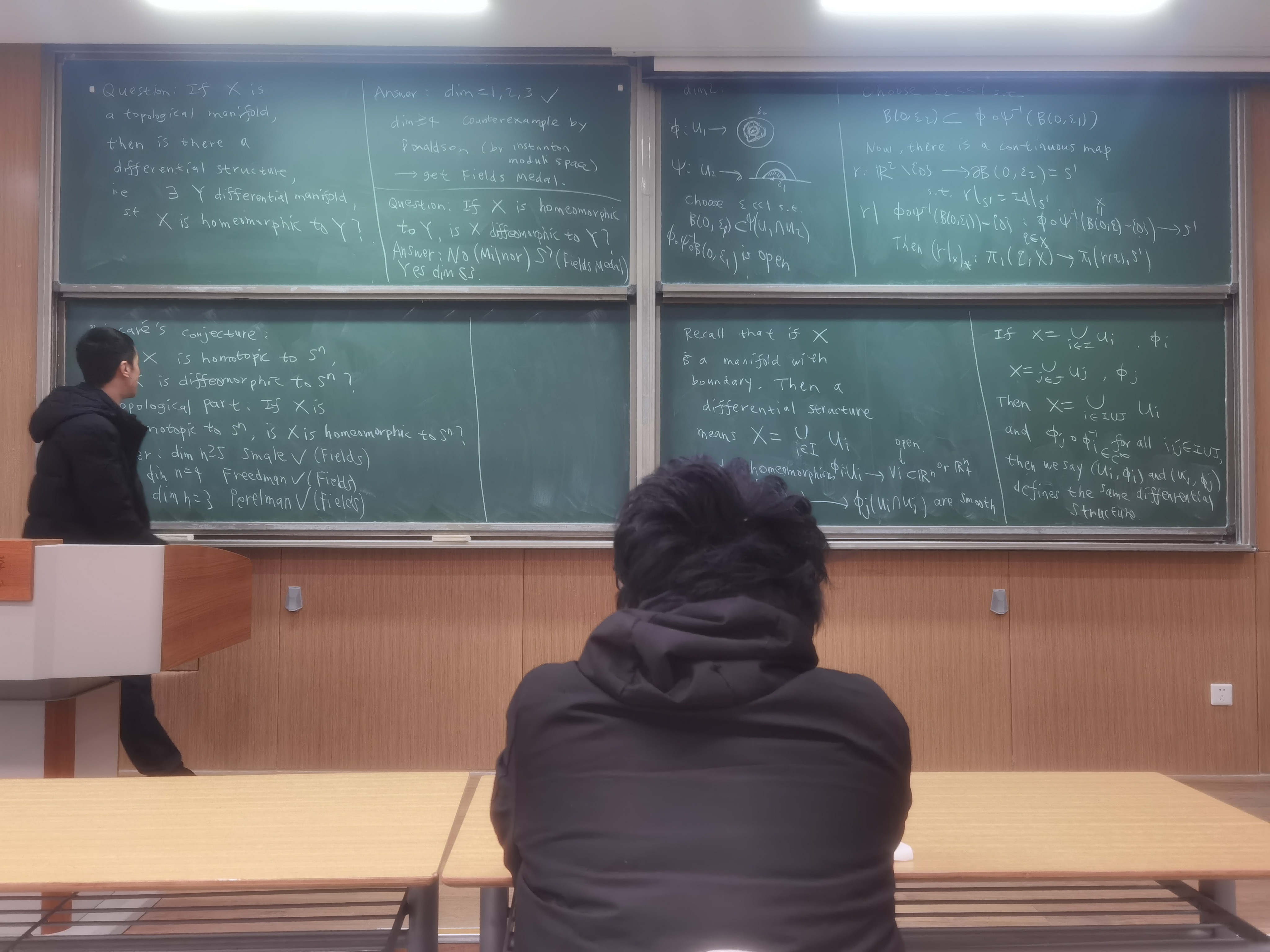 哦对,最后讲闭曲面分离定理,没有用传统功夫三角剖分,而是用 Morse 理论分类一维、二维流形,用了不少微分同胚的结论。中间 cg 有节课出差,兵子来代了节课,讲了点三维流形的东西(虽然大部分时间在侃大山)。然后也成功把 cg 布置的任务给忘了,期末考到后半程才发现没讲三维连通和。