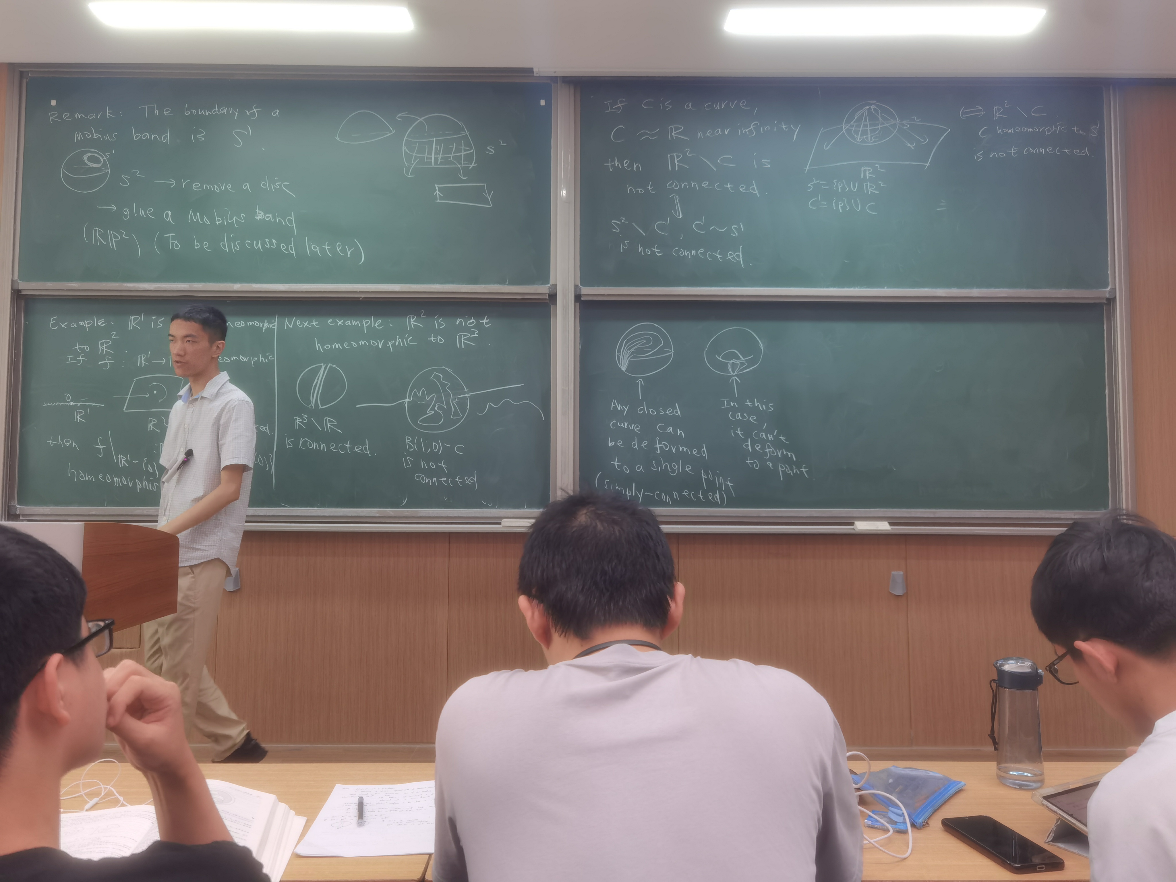 哦对,最后讲闭曲面分离定理,没有用传统功夫三角剖分,而是用 Morse 理论分类一维、二维流形,用了不少微分同胚的结论。中间 cg 有节课出差,兵子来代了节课,讲了点三维流形的东西(虽然大部分时间在侃大山)。然后也成功把 cg 布置的任务给忘了,期末考到后半程才发现没讲三维连通和。