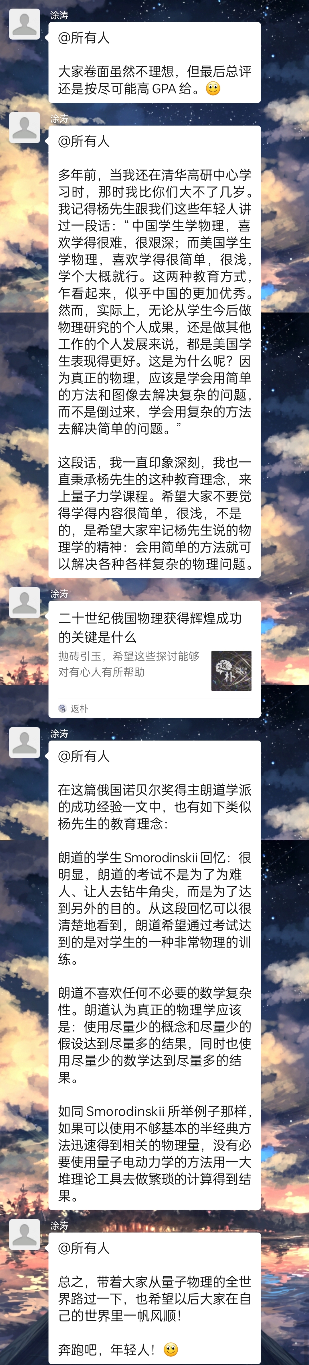 这学期因为数学分析叠课了还要点名,所以很遗憾没有机会听涂老师上课。听学长和朋友说,涂老师上课更注重物理素养而不是题目的难度,希望以后有机会带涂老师班的助教把这些没听到的课补回来吧。