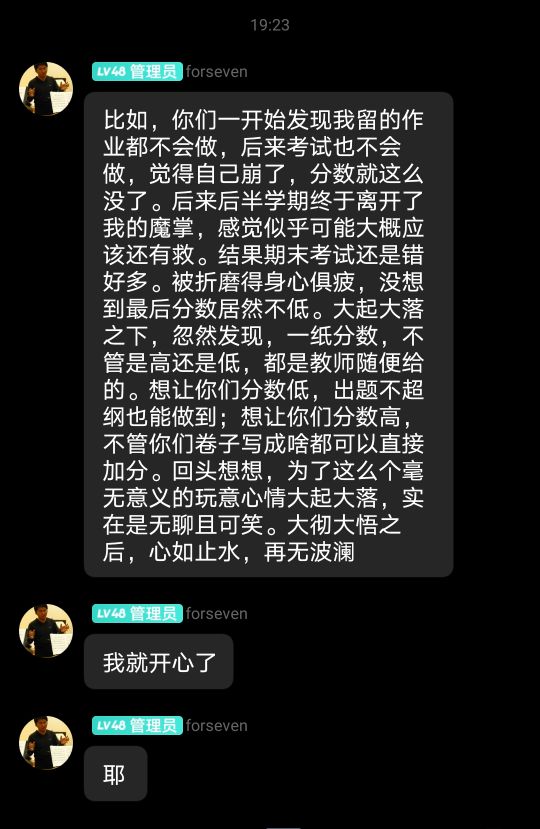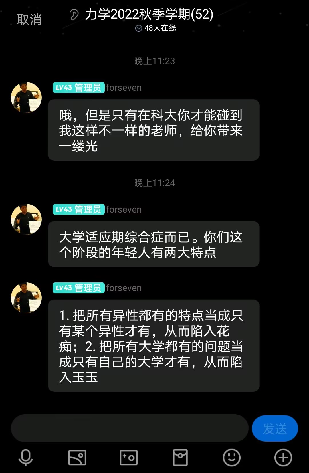 另外这门课上的过程中无数次有同学匿名在课程群抱怨质疑的,杨思奇老师都很认真的回复了很多他的想法和目的,完全没有生气或怎么样,好像也没关过匿名。杨老师也讲了很多经典的话,权且截成绩出来后最后这段放在下面。