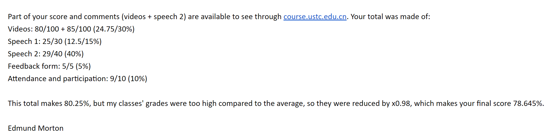 不过我的speech2安排在22秋学期将近遣返的那段时间, 彼时我由于感染了新冠实在没法上课, 向老师申请了延迟一周 (由于申请延迟的人过多, 那一周本该进行的上台演讲都推迟了) . 不知道这件事对打分有没有负面的影响.