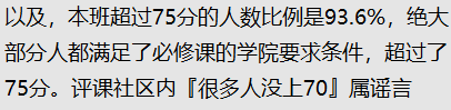 可惜,这门课的老师选择了最恶心的一条道路:自己念念ppt下课拍拍屁股走人,全程没出现在课程群里,布置一大堆纱暖作业,学生苦不堪言,课余时间被压榨无几,最后只有70+,换来助教群里的一句:93.6%的人过了75。