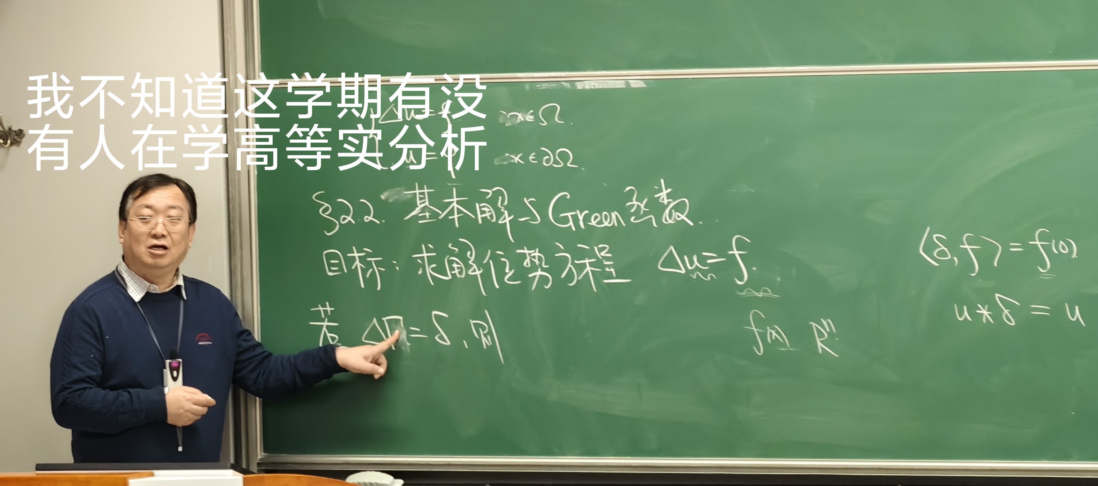 关于习题课:本学期的习题课不多(据助教所说,去年的习题课讲义已经充分完备了,日后这门课助教的任务可能就是不断地发现问题并补充完善吧),基本上全由尹助教和吴助教来讲,现在回忆起来便只记得blowup了。。习题课基本就是作业和一点扩展,扩展内容也没有很超纲,也是和这门课所学的知识紧密结合的。pde刚开始时专门就\(C^1\)边界,分部积分等东西讲了一节习题课,效果是相当灾难,不过事实上后面用到的也就只有分部积分和第二Green公式了;最后一节课好像还讲了点什么,不过我以为那节习题课在1.8晚上了。。