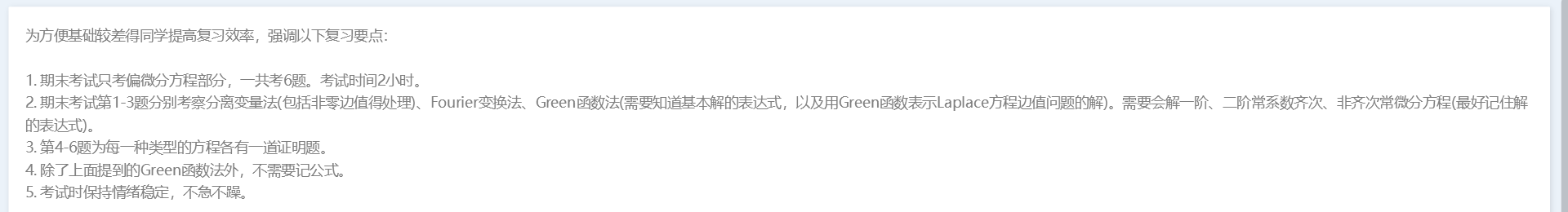 这门课通病大家都知道,内容多,学不过来。常微分部分较为简单,但偏微分一开始入手实在是比较困难。这也间接导致我后面偏微分部分没怎么学懂,喜提数学物理课以来最低gpa。