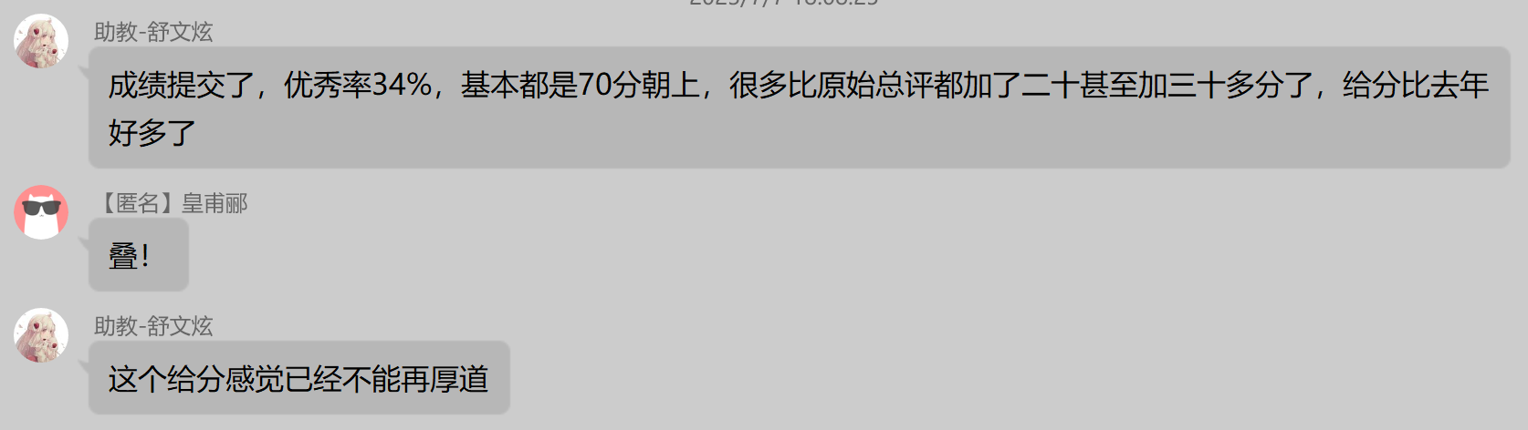 出分了,听说优秀率没给满,然而考试略低于平均分给了85,真的喜出望外了,不过可能也反映了一个问题就是可能是少量的高分把大部分低分的均分拉上来了,导致大部分同学的成绩是难以达到均分的。给分奶是真的奶,难也是真的难,建议看自己的水平选课(提醒:必修课不能退,在选课阶段千万确定自己适不适合这门课)