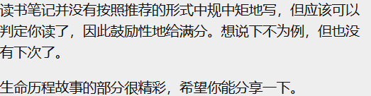 这是我最后一次作业老师的评价,呃,三次作业有两次我的字数也超了,但事实上没啥影响,归根到底,毕竟还是通识课,老师不会刻意找你的茬,按他说的,作业是为了鼓励大家阅读材料的。多确实是多了点,但老师也一直在采取措施不让大家挂科,也经常提醒大家交作业最后还有补交通道。