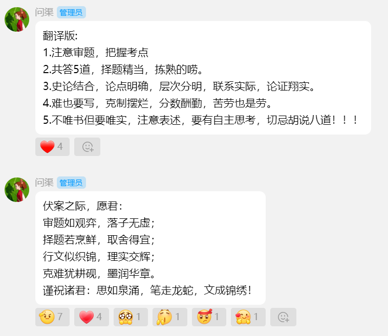 贴老师在群里发的一段话,谁懂我这💩一般的笑点关于考试,再唠叨几句哈:1.定好闹钟按时参加考试哦。不然一通操作猛如虎,一学期白干满心酸楚。2.考试内容不会脱离教材和课程讲述,但是考察形式会比较灵活。建议提前熟悉教材,温习上课所讲内容。临时抱佛脚有风险,多读些文献没坏处。3.先列点再阐释。阅卷老师还是需要通过答题思路,才能领略各位思想之精深。4.不要假借“马克思”之名,构建自己的“主义”。“实事求是”很重要,惜字如金不可取。有想法请你大胆写出来。5.重要的事情,打三遍感叹号。总共答五道题,简答3道,论述2道!!!答多不扣分,but费力费时间。最后,祝愿你们不学都会,会的都对,考试都顺。