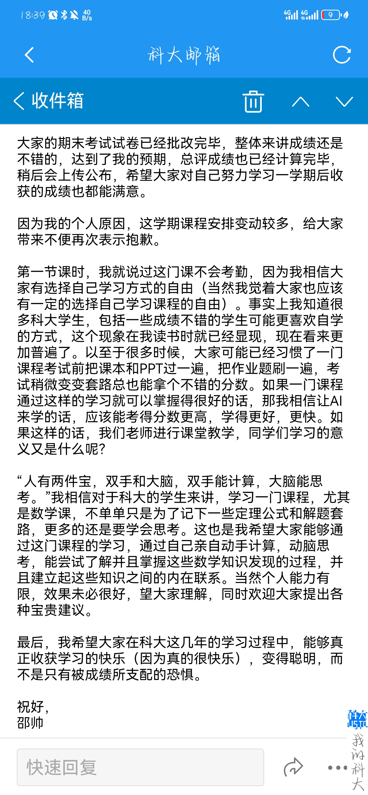 最后,我希望大家在科大这几年的学习过程中,能够真正收获学习的快乐(因为真的很快乐),变得聪明,而不是只有被成绩所支配的恐惧。