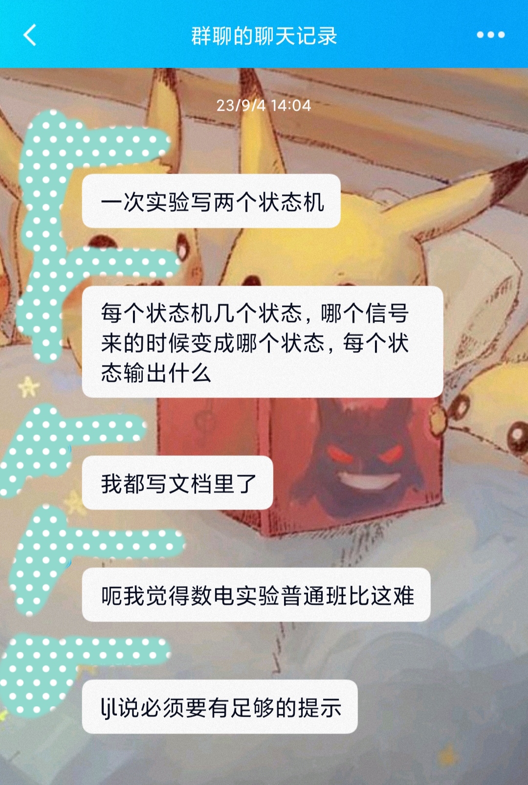 作为「内部人员」,我本来是打算在每一次实验发布前就把实验写好,帮助同学们踩踩坑的,但由于巨大拖延症 + 被实验室派活 + 忙着写数电实验文档 + 还没有从暑假中缓过来,我从 DDL 领跑者逐渐变成了 DDL 烈士,最后直接躺平了。所以说大四以及不在意成绩的同学来选这门课其实很爽的(