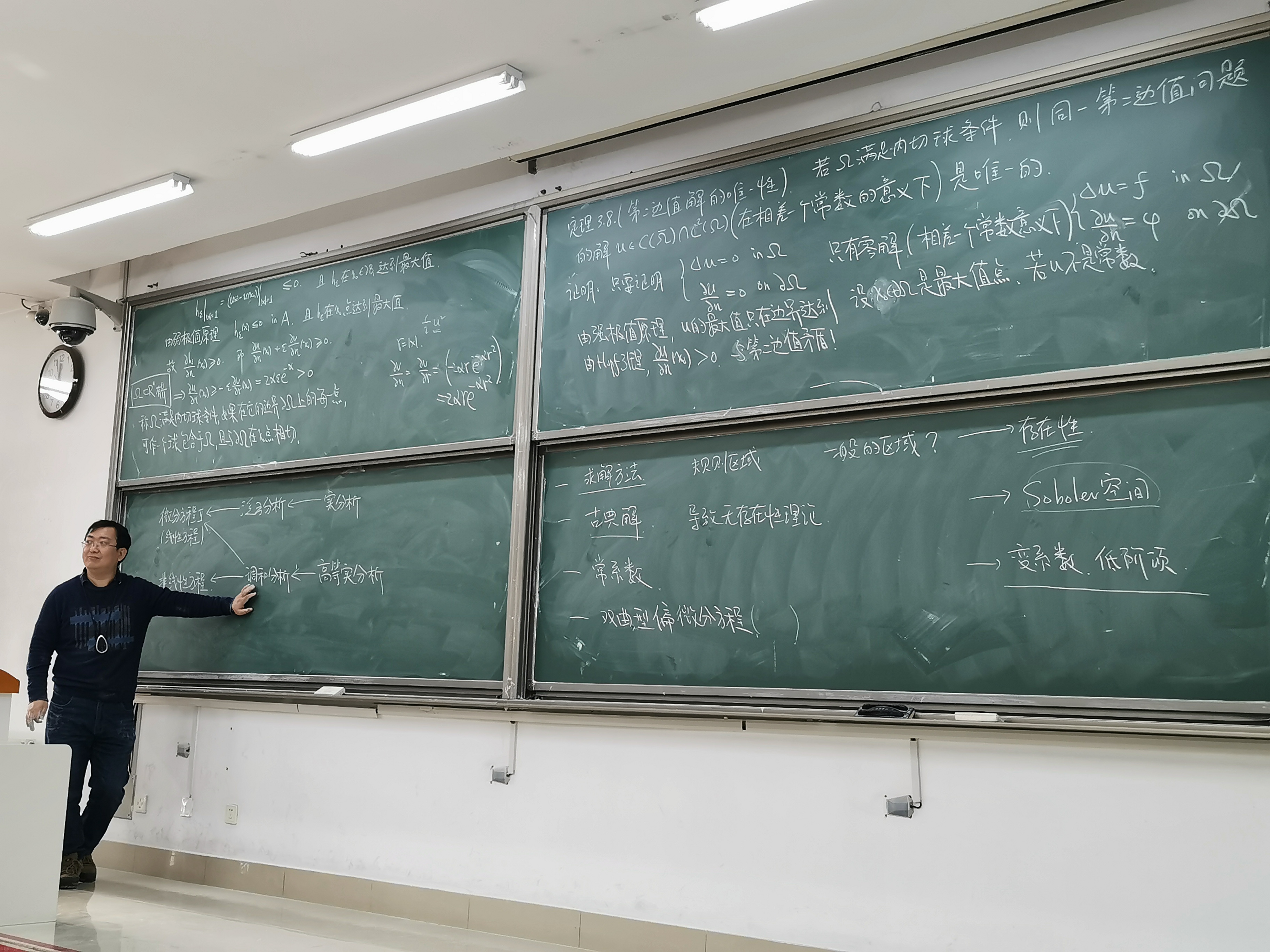 偏微分方程是赵老师的本行,主要讲了三类方程的一些求解方法和基本性质。由于这部分的上课时间只有不到一个半月,考试时间又比较早,赵老师和大家商量后把课程增加到每周五学时以便提前结课,给大家更多的期末复习时间,可以说是相当贴心了。不同于往年的是,赵老师选择了谷超豪校长的《数学物理方程》作为主要教材,没有选择Evans或者Strauss,但在一些结论的证明上采用了Evans上的方法,同时椭圆方程部分选择了按照韩青林芳华的第一章讲授,个人认为这种尝试非常好,回避了Evans上一些对初学者不太友好的内容(如heat ball,一般维数的波方程求解),丰富了椭圆方程部分的内容,把韩青林芳华书上省略了很多细节的证明讲得非常清晰。当然讲得清晰不代表你听过一遍就会了,很多东西还是要亲手算一遍才能真正理解。