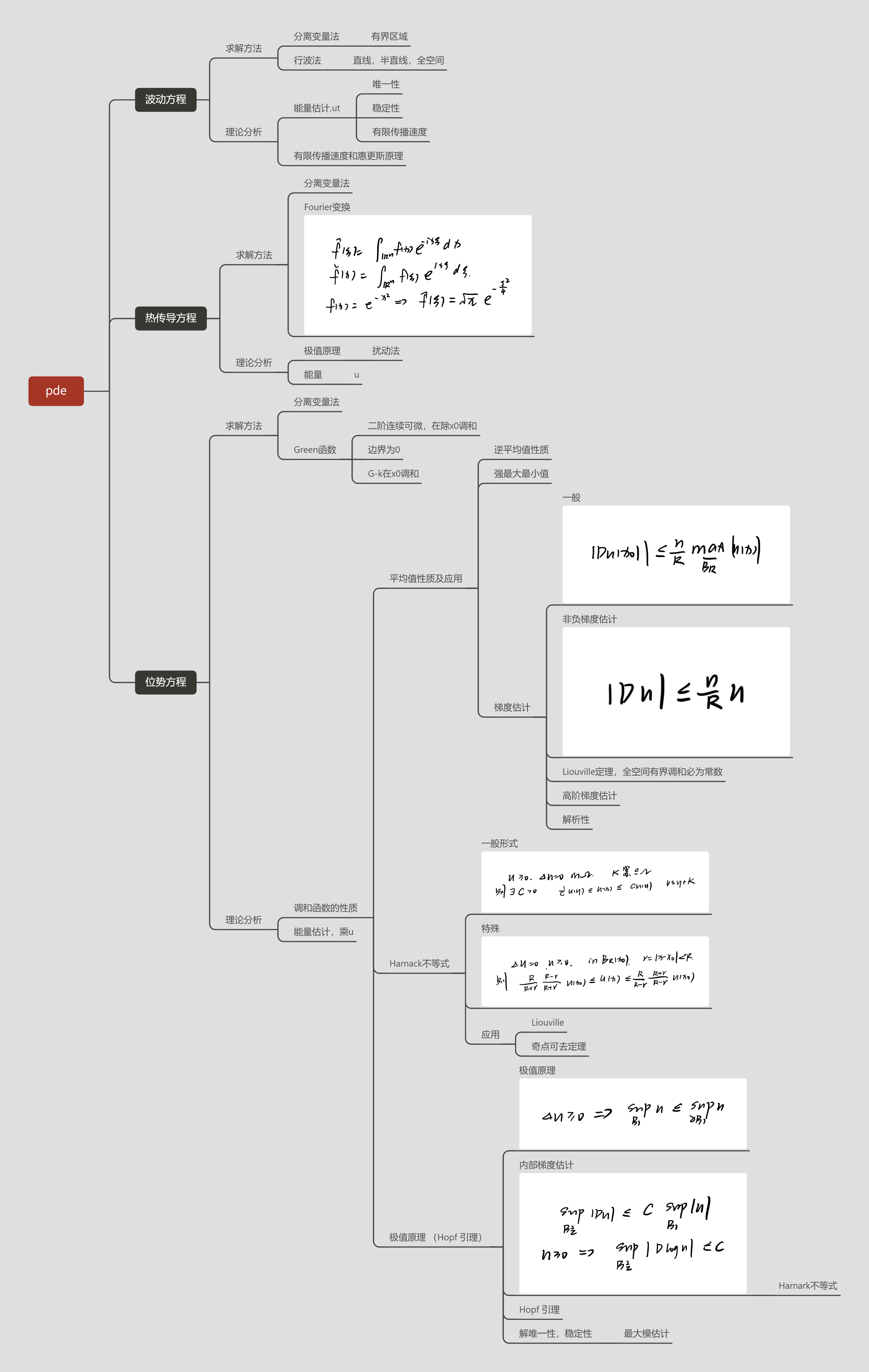 PDE部分给我印象最为深刻的就是调和函数里面各种性质的讲解,motivation, 各种精妙的估计和构造,截断手法。涉及到平均值公式,极值原理,梯度估计,解析性,Harnack不等式,可去奇点定理,最大模估计,Hopf引理等等。
