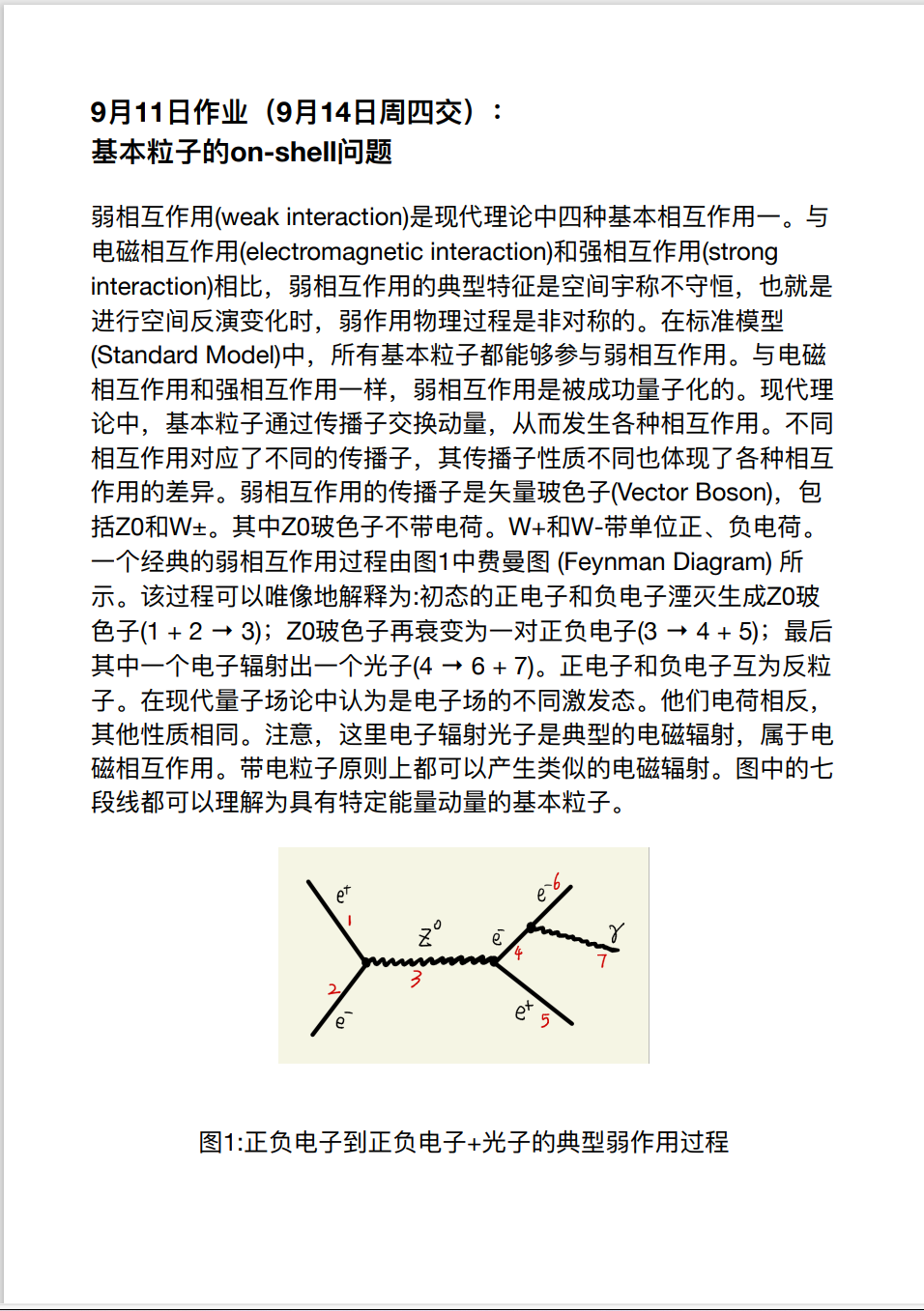 首先是课堂内容上。杨思奇老师是搞粒子物理的,所以开学那几周的上课内容和作业都是与粒子物理相关的。这些题大概是为了锻炼学生的大文字阅读和理解能力,其实所运用的知识基本都是高中内容(比如动量、能量守恒),还掺杂一些新的内容(比如质心系)。