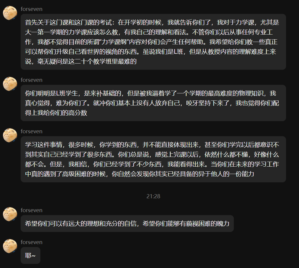 最后期末也是稀里糊涂的考了个对我来说还可以的一个成绩,老师也捞了我。我从来没想过在这门课上能得到这样的成绩,🐏老师说不要透露他给分的情况所以我就打了个一般,他希望选他课的人不是冲着分数去的。总之,47老师除了上课节奏让我绷不住以外,其他的方面都挺好的,推荐想学好力学的人选。