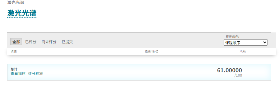 这门课上课氛围比较轻松,老师会深入浅出的讲解激光光谱的相关内容,平时作业作为平时分,交了就行,期末考试是一道大题,老师会在最后一节课说考试内容,打印相关综述就差不多可以找到答案。给分非常好!想要事少给分高可以冲!