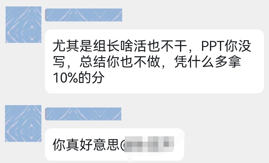 同时,小组展示有一部分的得分是靠同学互评给出的,这也让大心的给分不够透明和可靠。可能出现的情况包括但不限于,给自己要好的同学打高分而给别的同学打低分,各个小组的评分基准不一样(比如有的组觉得其他组一般般就打80,有的觉得一般就打70),🈶坏β恶意给别人打低分等等。
