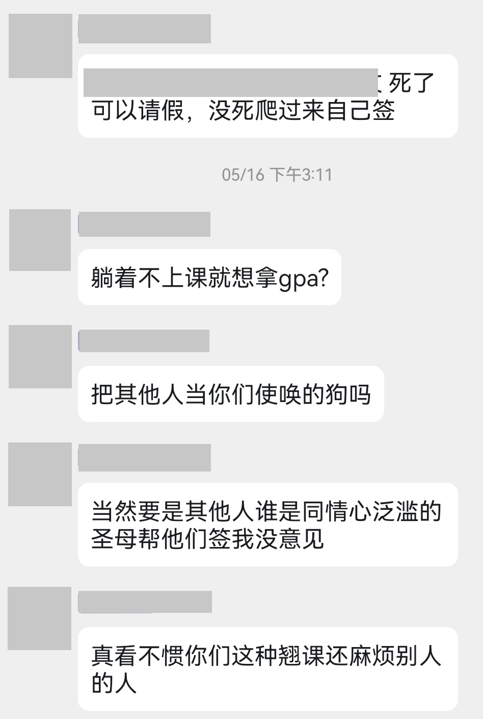 某个组里破防的姐还是ssw吧 在组群里骂组长摆烂 骂代签到 您可真高尚呢 人家组长是掷骰子选出来的 当时怎么没见您要当呢 看见平时分110%酸了?骂代签纯属五十步笑百步 您这么高尚怎么还屡次签完到就走呢
