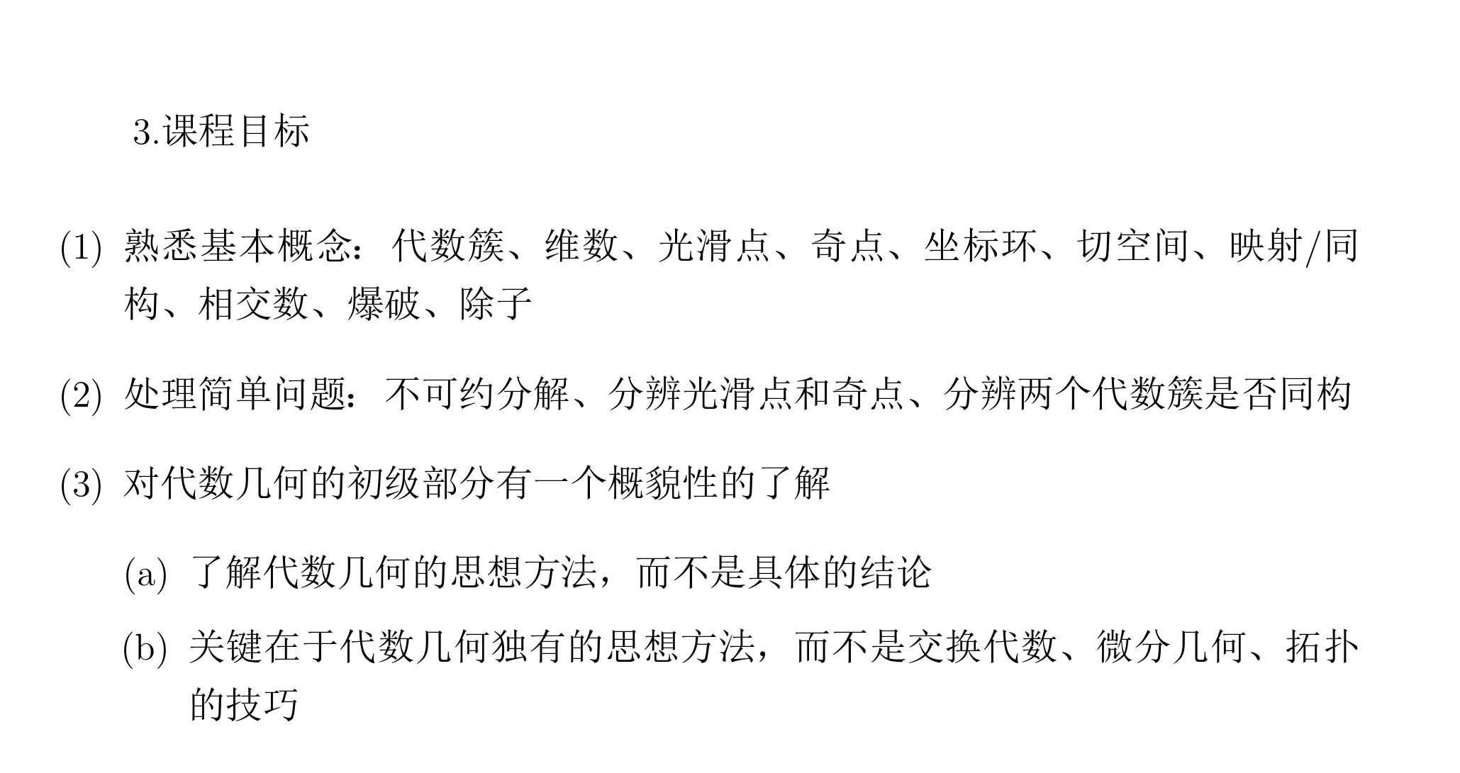 课程内容大致如上, 还会有一些其他的定理, 比如光滑点构成一个复流形, 周炜良定理, 一些开性定理. 主要就是讲一些仿射簇, 射影簇, 仿射坐标邻域一些的. 内容不多, 难度整体也不高, 还是偏向古典的代数几何, 隔壁交代一上来就讲了Spec ...