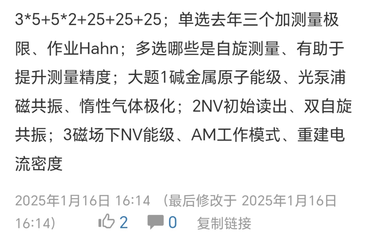 选择题考了洛伦兹线性斜率最大的点,还有Q值三个内涵,SERF磁力计的工作条件,其它忘了。