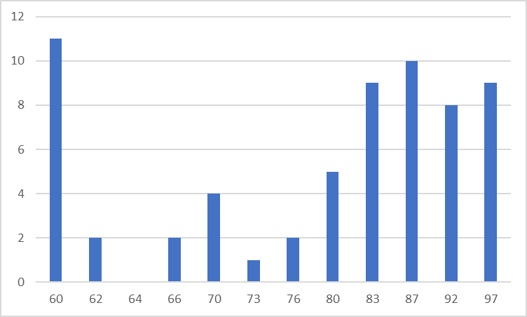 还是心血来潮写点相关吧,依据给分公式,可以近似认为总评就是期末分数,至少在高分段如此,取绩点百分数中间值近似有如下分布