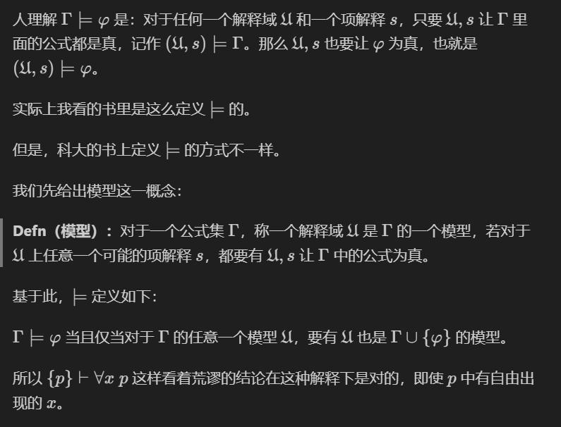 有了这个那 \(\Sigma \models \alpha\) 怎么定义呢?我看的书和科大的书定义是不同的: