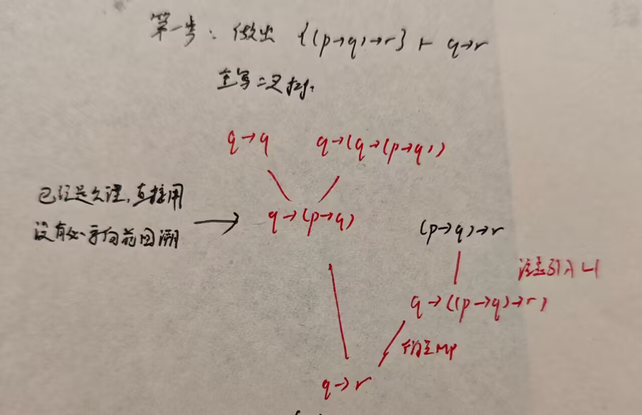 我们首先回答第二个问题: 由于 q_{i,j,k} 是一个满足 MP 所需形式的三元组, q_j 一定形如 q_i→q_k (或者相反, 但这里 q_i 和 q_j 地位是相同的, 无需另外讨论) . 我们可以先用 q_i→q_k 结合公理模式 L1 通过 MP 得到 p→(q_i→q_k) , 再用公理模式 L2 写出 (p→(q_i→q_k))→((p→q_i)→(p→q_k)) , 连续 MP 两次得到 p→q_k (下文中将这整个过程称为 “衍生 MP” ) .