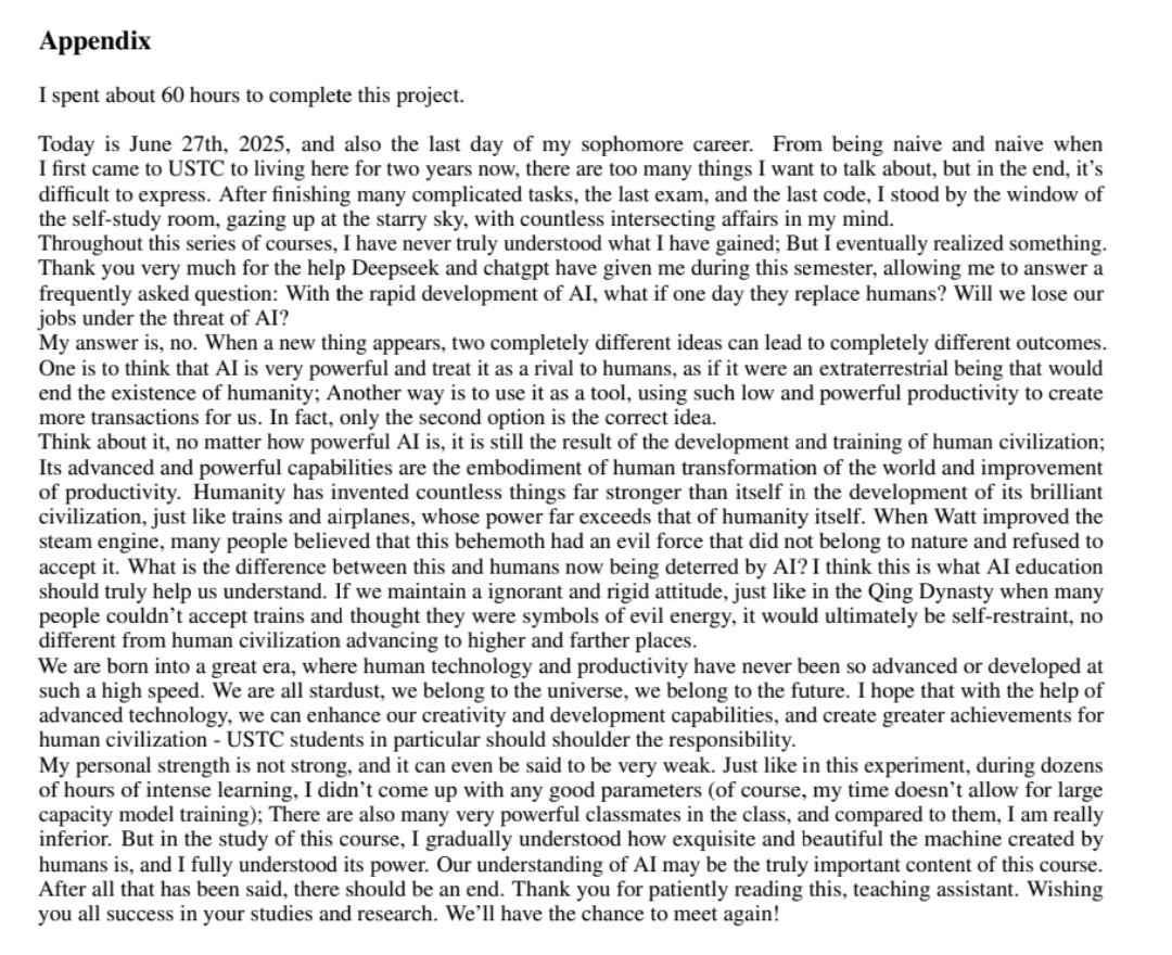 另外大作业任务量确实不小,大家能组队就组吧。我因为比较懒没有找队友所以就solo了大作业,还是挺累的QAQ。我的实力其实很弱,班里大佬云集,大家的实力比我是强上许多的;但是我依然在这个课程里有着不小的收获,P人的属性有时候反而会逼着我去适应和进步。比如因为overleaf改中文很麻烦,我寻思直接用英文写论文吧,虽然我英语水平不行,但起码也得到了很好的锻炼;没有队友的协助反而要求我必须去亲自了解分析,试验到学术写作的全过程,没有摆烂的余地,帮助我很好的提升了自己的能力,诸如此类。希望和我一样水平较弱的学生可以也拥有这样的心态,不必比别人强在哪里,我们只要走在努力的路上,就是自己的成功!
