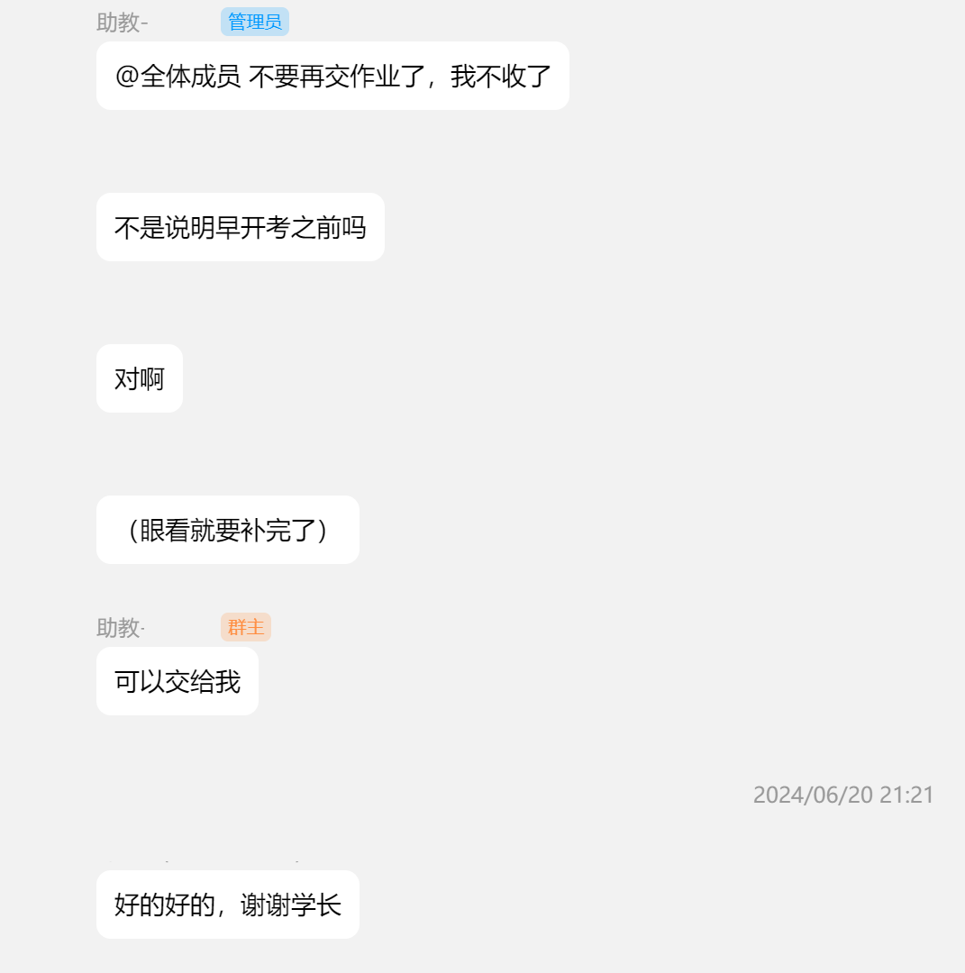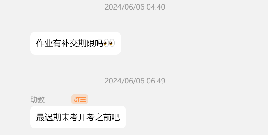 习题课没去过就不评了,但光看习题课讲义能发现,这学期有一位助教写的习题课讲义比较潦草,希望之后能用Latex写,或者写的工整些也行。另一位助教的习题课讲义就不错(就是上面发的那份)。另外,补交作业这件事上助教的操作也比较抽象(见下图)
