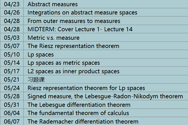 按照stein书上的顺序,期中前讲了Lebesgue测度和积分,期中之后花了两周讲fourier变换(感觉主要就是approximation to identity也就是delta函数)然后花了一整个月讲Newton Leibnitz 公式。。。最后讲一周的抽象测度就结课了。