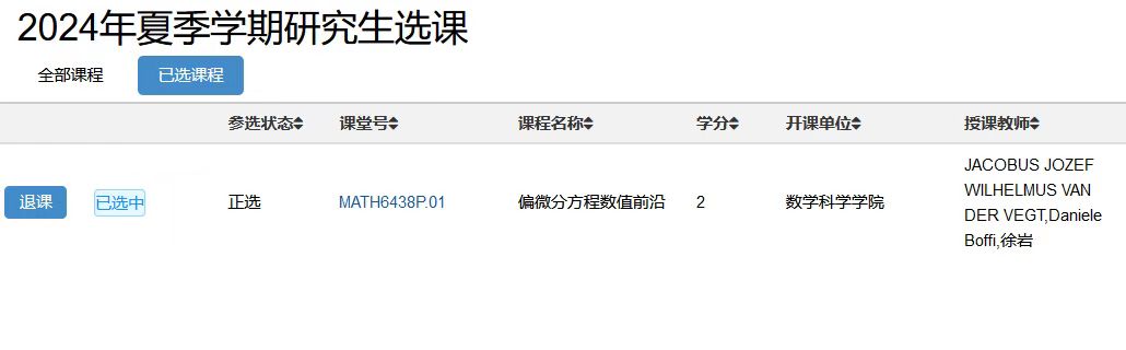 2024夏季学期正值我本科毕业保研为本校硕士生的间隙,当时我打算刷两个成就:第一是用教务系统的本科生账号选一门“四夏”的课,获得一次毕业后才到手的学分。我恰巧对计算机图形学感兴趣,于是选上了《计算机图形学前沿》,但这门课的时间安排恰好与我去北京大学参加的暑期学校重叠了,于是不得不退课——虽说挂了对我也没影响,但是这门课已经爆满,挤占了学弟学妹的名额可不好。另一个成就则是当时教务系统的研究生账号已经可以用了,于是我打算再用研究生账号选一门夏季学期的课,在入学报到前就卷到2个学分,上个“〇夏学期”。我的研究领域是MHD数值模拟,对偏微分方程数值有要求,于是我就选择了这门课,期望能学些东西。