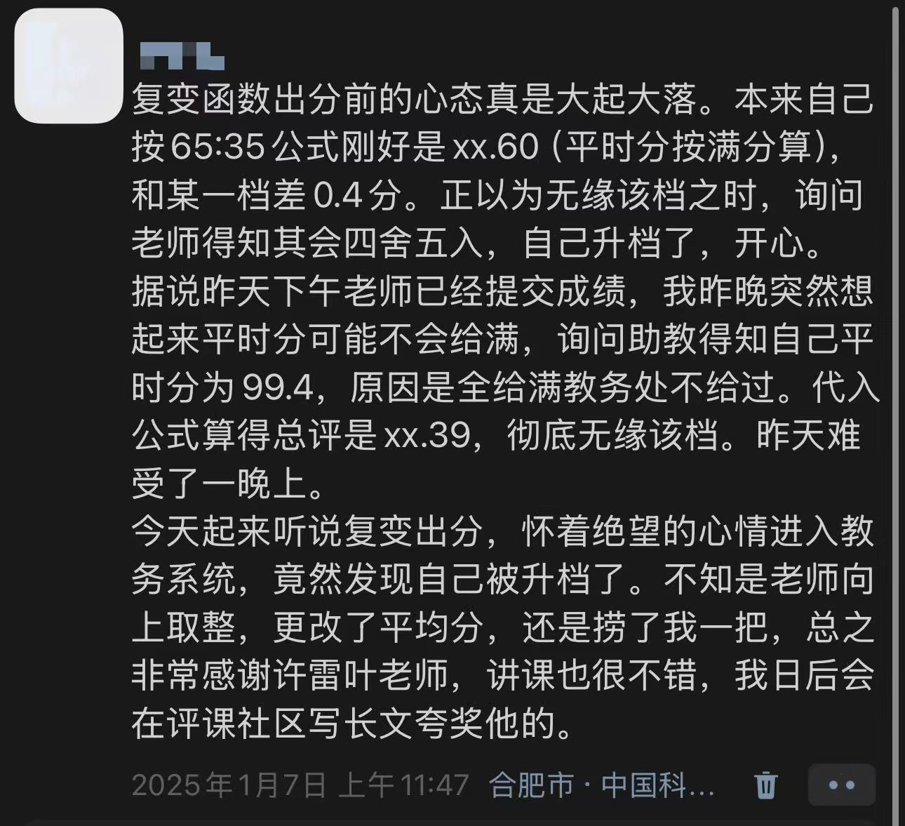 有关给分。平时分来源于每周作业,我的作业都是线上提交,遗憾的是助教并未给出批改反馈;最后平时分为99.4,据说是教务处要求不能全给满。期末84,批改很松,如我填空题有一个奇点写错只扣了1分;我最后一题后两问都没做出来,根据实部算解析函数失误算错了扣了5分。今年卷子稍难,不过我们班普遍分数较高,最终老师应该是按照 平时:期末=35:65 来调分。我的最终总评是90,喜提4。这里附上我出分前波折的心路历程:(xx=89)
