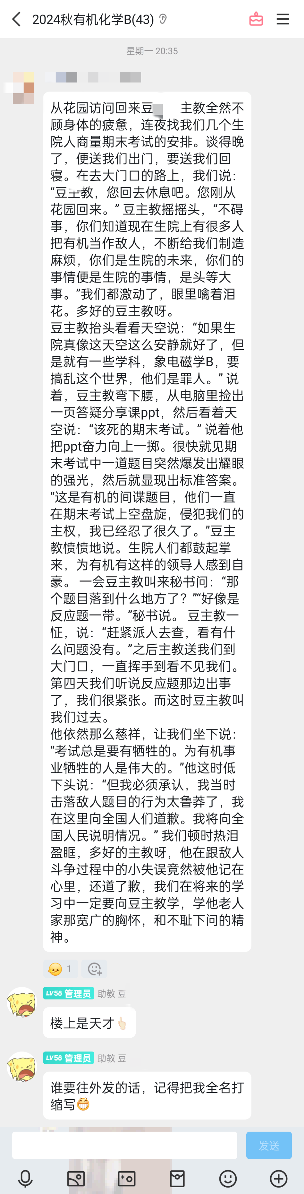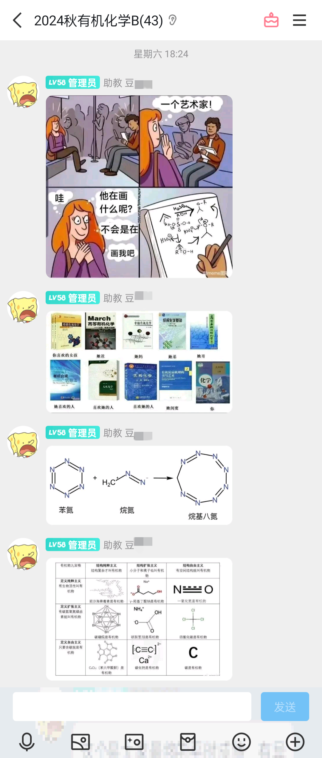 记得当时考完期末,拿回手机再打开有机的课程群,看到豆助教宽慰大家的留言,以及没有留存的课程资料,半开玩笑地说了句要重修怎么办的丧气话,又怕引发大家的负面情绪,赶紧撤回了。