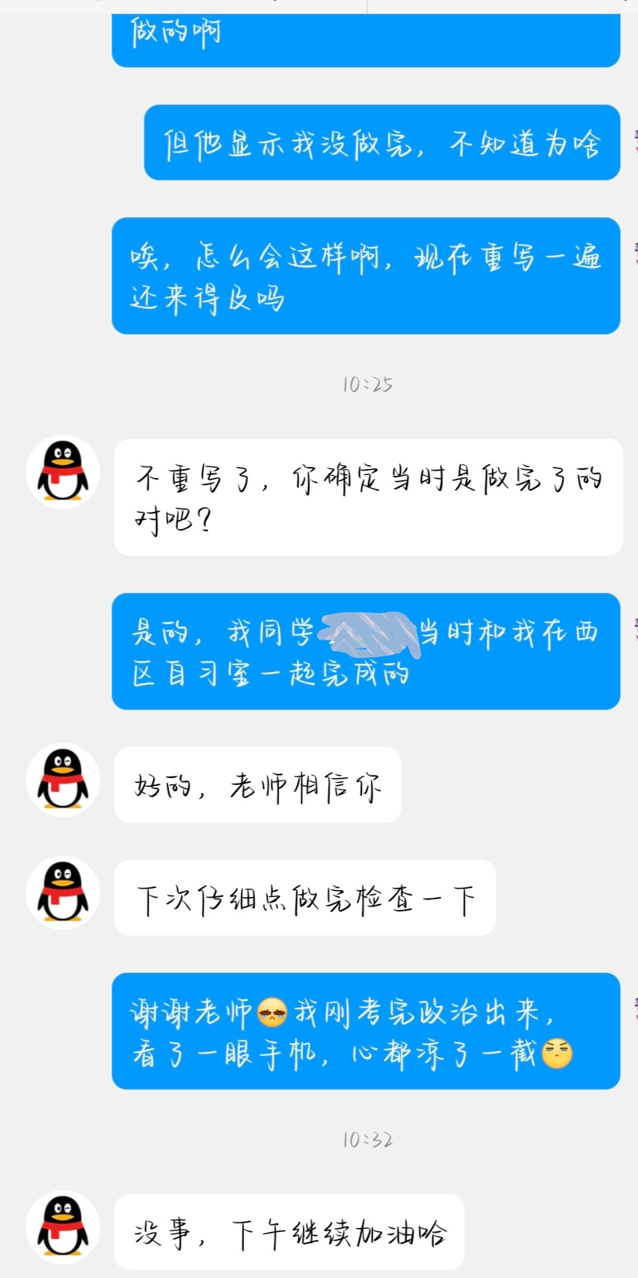 本来以为怎么解释都说不清了,但是老师选择了相信我并给了相应的分数。说实话,有这样一位体贴的老师是我的幸运