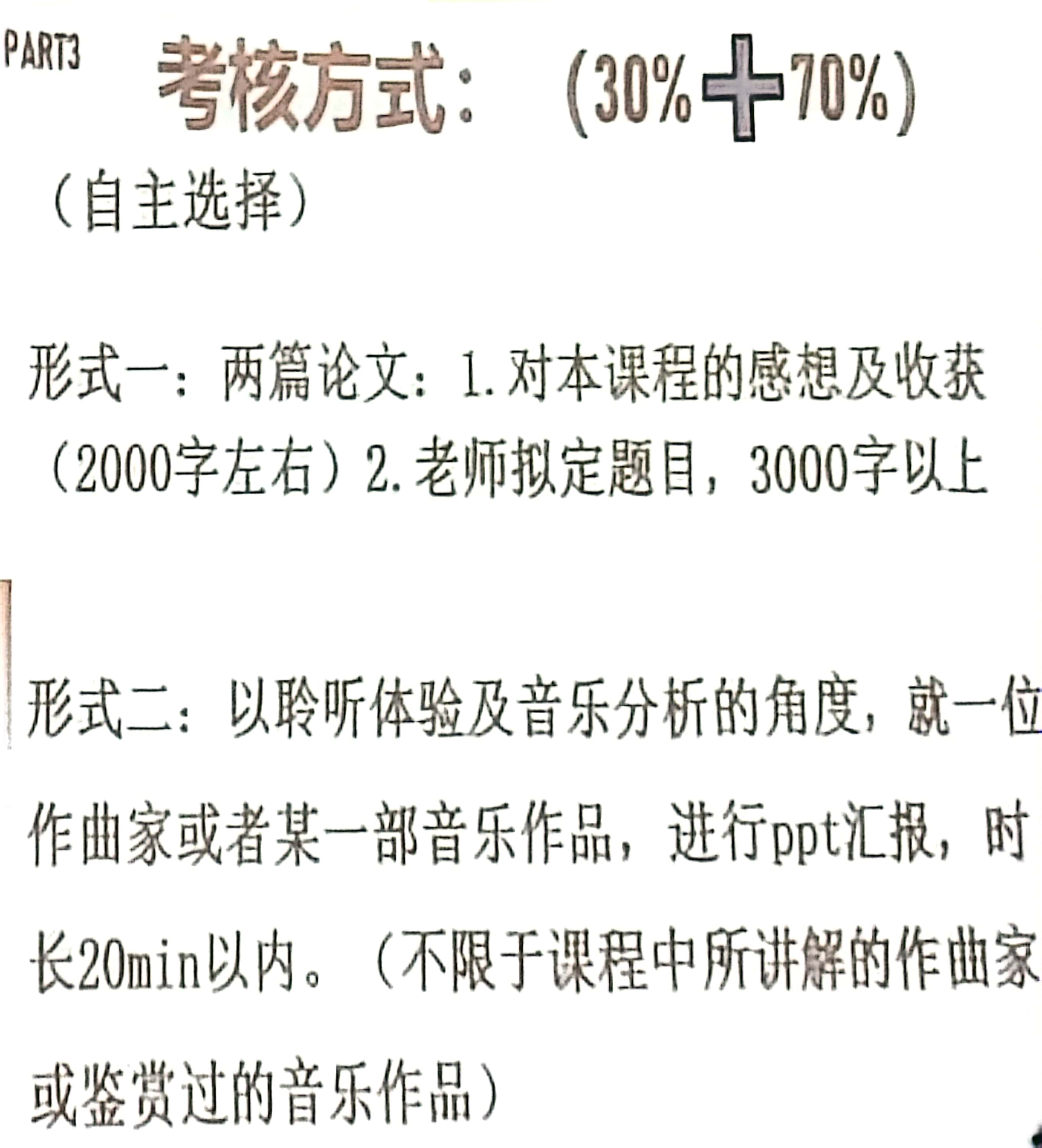 这门课不管你是水学分还是想拿高分的都可以选。想拿高分的可以选PPT考核方式,老师说过会尽可能给选PPT的同学高分。我是选的高新区的课,选PPT的人不多,而且大部分做的都很好。选择论文的话字数要求会多一点,课程感想2000+选一部作品的音乐分析与聆听感受3000。会点名。