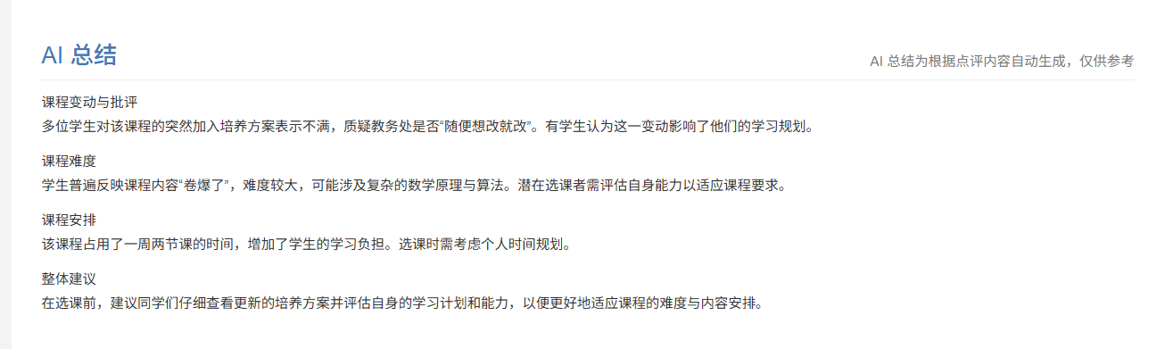 该课程的安排受到了广泛的批评,因突然将其设为全校通修课,尤其是未提前通知24级学生。中途插入一门原计划大一选修的课程让许多学生措手不及。此决定被认为是缺乏周详考虑且学生的学习节奏受到打乱,尤其是在大三阶段给学生增加额外负担引发更多不满。修改方案的突然性和随意性引发了学生对教学管理的不满。