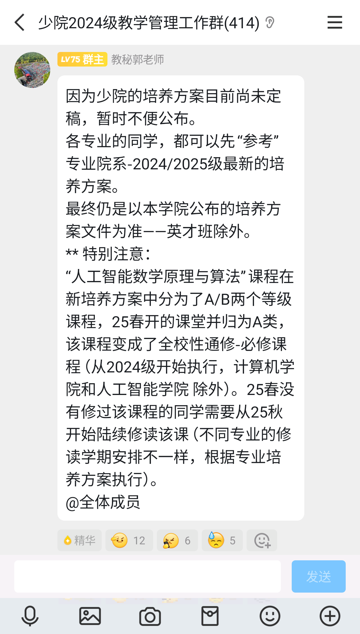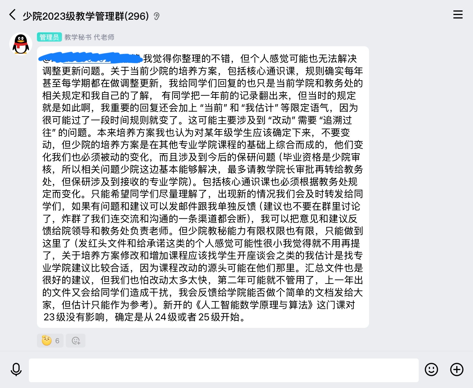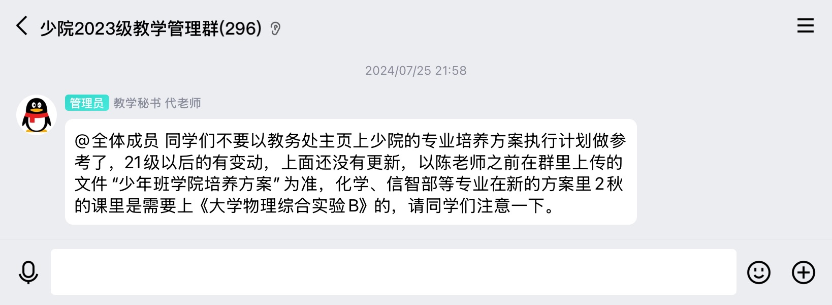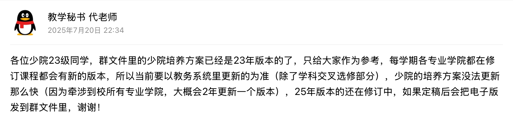 事情的转折点在2025.7.22下午,24级少院教秘群里,教秘发了一条消息: