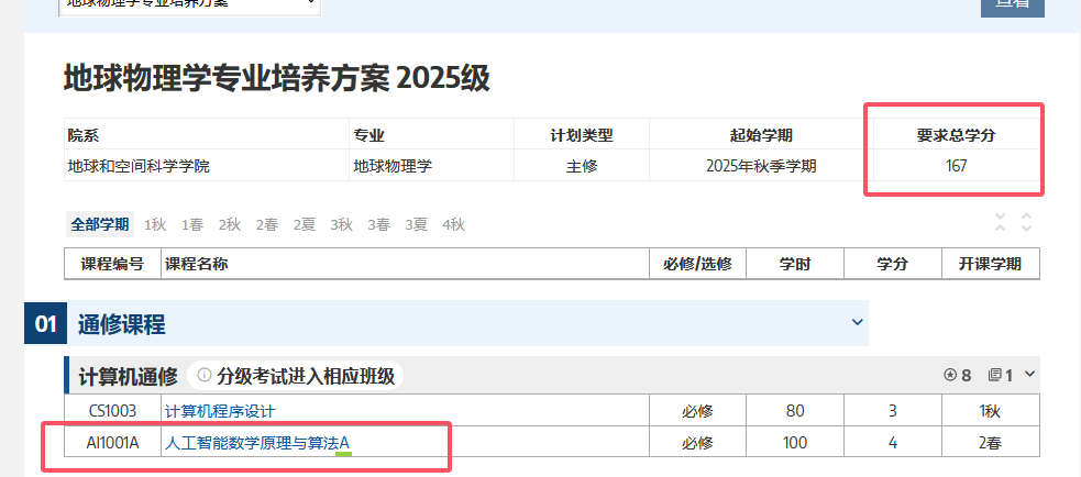 老登来凑个热闹,想到一个幽默的事情,一方面,23和24ai的置课频频《出错》,教务处上写的培养方案直至选课开始都没改过来(现在还没完全改过来),23ai的机器学习A课程消失了快一年了,24ai新的培养方案更是几个月前就已经制定好。一问就是所谓:《培养方案不能随意改动》《正在申请》,另一方面平地起惊雷,随意的给已经大二的同学增加大一的通修课程。