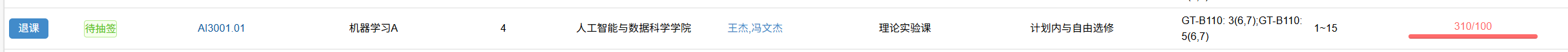 三编,再说一个幽默事情,由于ds的机器学习概论与ai的机器学习A合并,且只开一个课堂,出现了310/100的选课盛状,虽然说是要扩充课堂容量,但是考虑到高新的教室太小,即便是GTB112/212这种大教室,150-160人已经是极限了(总不能在报告厅上课吧),而选课人数仍然是这个数字的两倍。