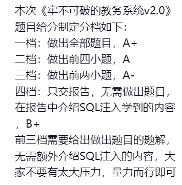 对于大二学生来说这门课程的内容设置上是很困难的,不过如果肯向各路人脉大佬求教的话绝大部分题目都可以完成,整体收获上也都可以了解web,sql,crpytography,misc等方面的有关知识,算是挺有帮助的。但是由于jwc的大米田共优秀率限制,导致同学们在分数差不多的情况下硬卷报告精美度,反而脱离了这门课的创设初衷,希望能不断完善网安院内的实践实验项目,让同学们在学到知识的同时也能在科大如此病态的压抑内卷环境下取得好的分数。