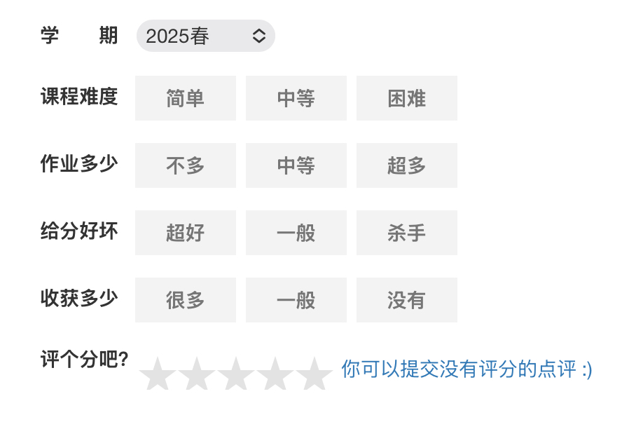 Update: 好像有同学好奇怎么提交没有评分的点评,这里说一下,“课程难度”“作业多少”“给分好坏”“收获多少”全都不要点,评分那里先随便点一个数,然后双击后面评分的数字,就可以做到提交没有评分的点评