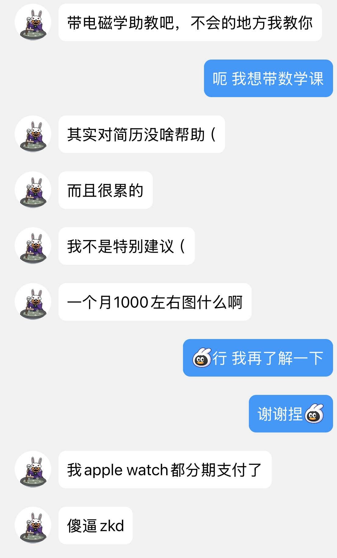 很多同学说这位w助教非常负责,我一开始得知其整理电磁答案和量物资料的时候也是这样认为的。那是什么时候开始改变想法的呢?半个月前很多同学都开始申助教,而我因为没有哪门课成绩特别突出,于是在QQ空间表示下学期可能当不上助教了非常遗憾,并且问了一句有没有我可能能带的课程。于是你们的w助教就来私信我建议带电磁,“不会的我教你”。本人纯种数学人(w助教知道这件事),方向可以说和电磁毫不相干,自然不会无聊到去带电磁学误人子弟。我拒绝后他立刻改口说,不建议带助教,钱少事多还没什么用。还有脸说别人双标,谁双标得过您啊?那我请问,如果w助教真的认为带助教这么不值,为什么一开始要推荐我带电磁呢,英雄救美的动画片看多了?自己当助教又是出于什么意图呢?到底是真心实意地想帮助同学学习,还是只是喜欢整理资料带来的满足感,顺便树立聪明善良尽心尽责的人设,方便自己胡作非为?